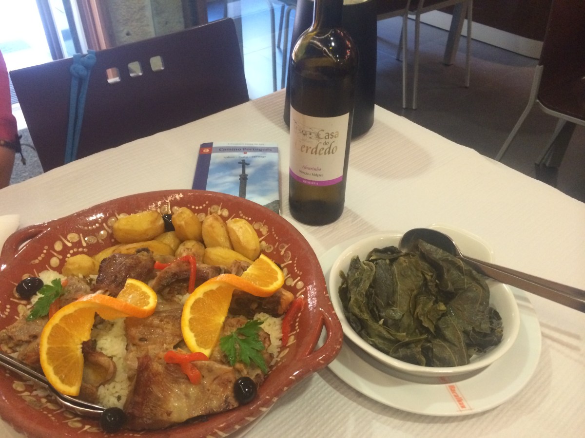 Camino Portuguese-541 Published August 29, 2014 at 3264 × 2448 in Day 16, Vilarinho to Barcelos, 33.7km ← Previous Next → A delicious roast lamb with a bottle of Alvarinho
