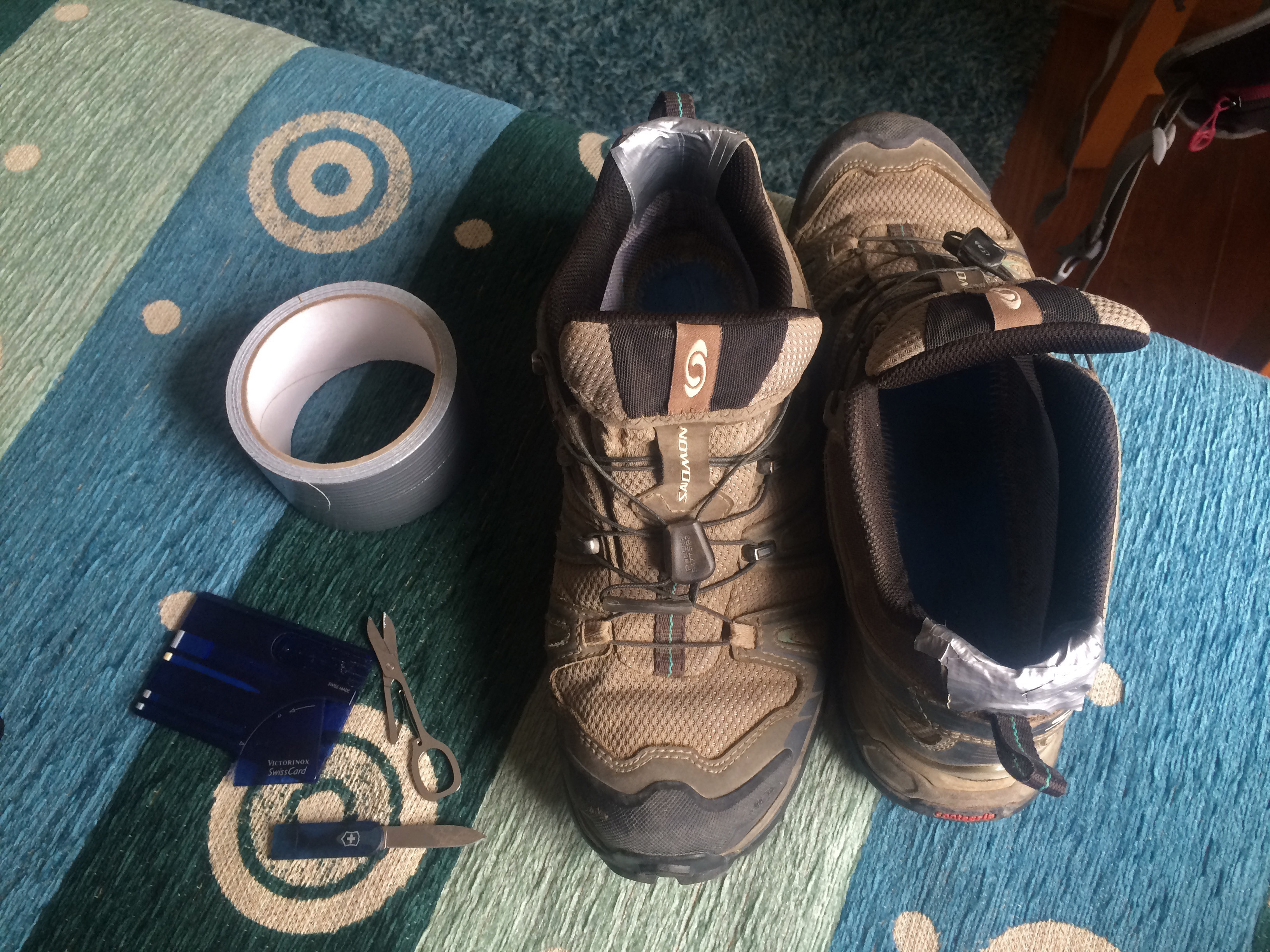 Camino Portuguese-230 Published August 29, 2014 at 3264 × 2448 in Day 7, Tomar to Alvaiazere, 34.2km ← Previous Next → Trying to fix my shoes!