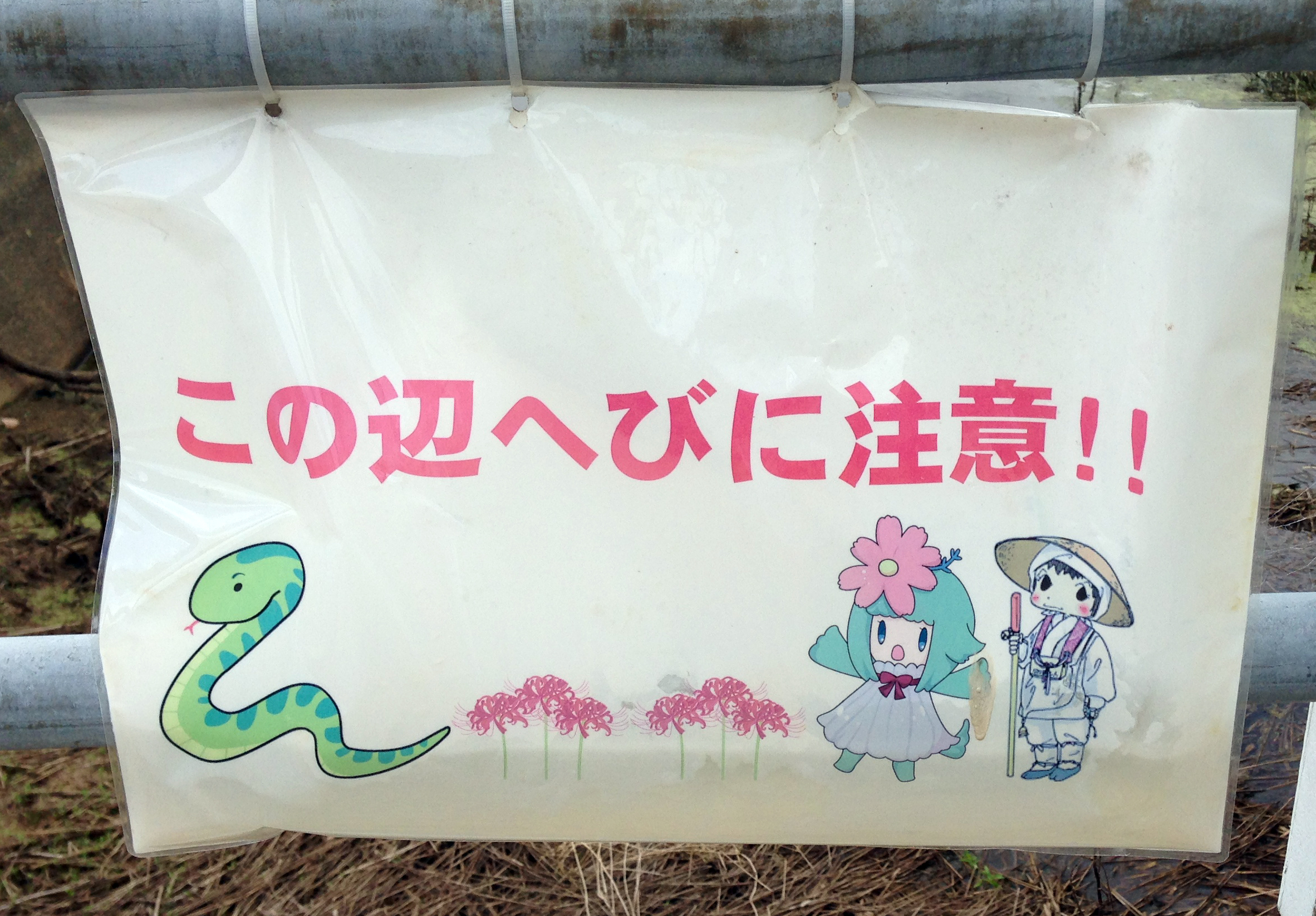 Shikoku 88 Temple Pilgrimage-016 Published September 19, 2014 at 2364 × 1644 in Flora and Fauna (or things to watch out for!) ← Previous Next → ‘Kono hen hebi ni chu-ii’ – warning there are snakes in this area. (hiragana and kanji)