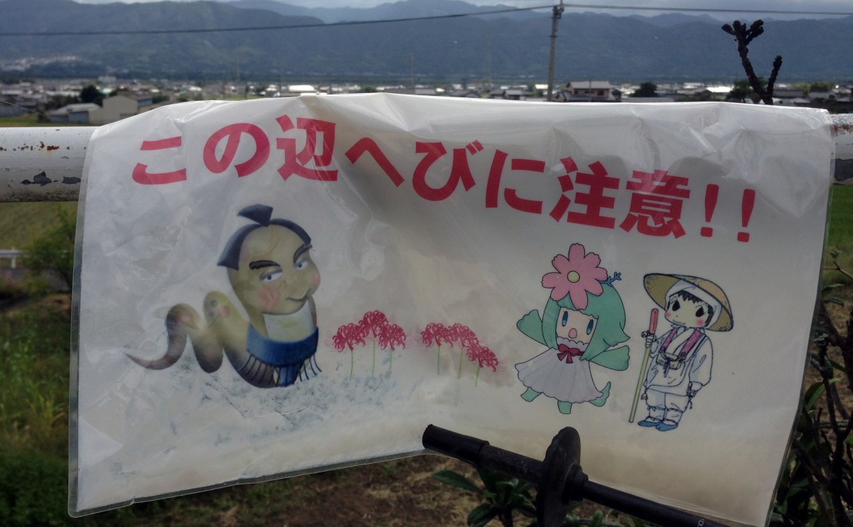 Shikoku 88 Temple Pilgrimage-019 Published September 19, 2014 at 2913 × 1802 in Flora and Fauna (or things to watch out for!) ← Previous Next → ‘Kono hen hebi ni chu-ii’ – warning there are snakes in this area. (hiragana and kanji)