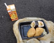 Shikoku 88 Temple Pilgrimage-0085 Published September 20, 2014 at 3792 × 3072 in Day 2, Temples 6-10, 24.6km ← Previous Next → Sushi and orange juice from a convenience store for lunch