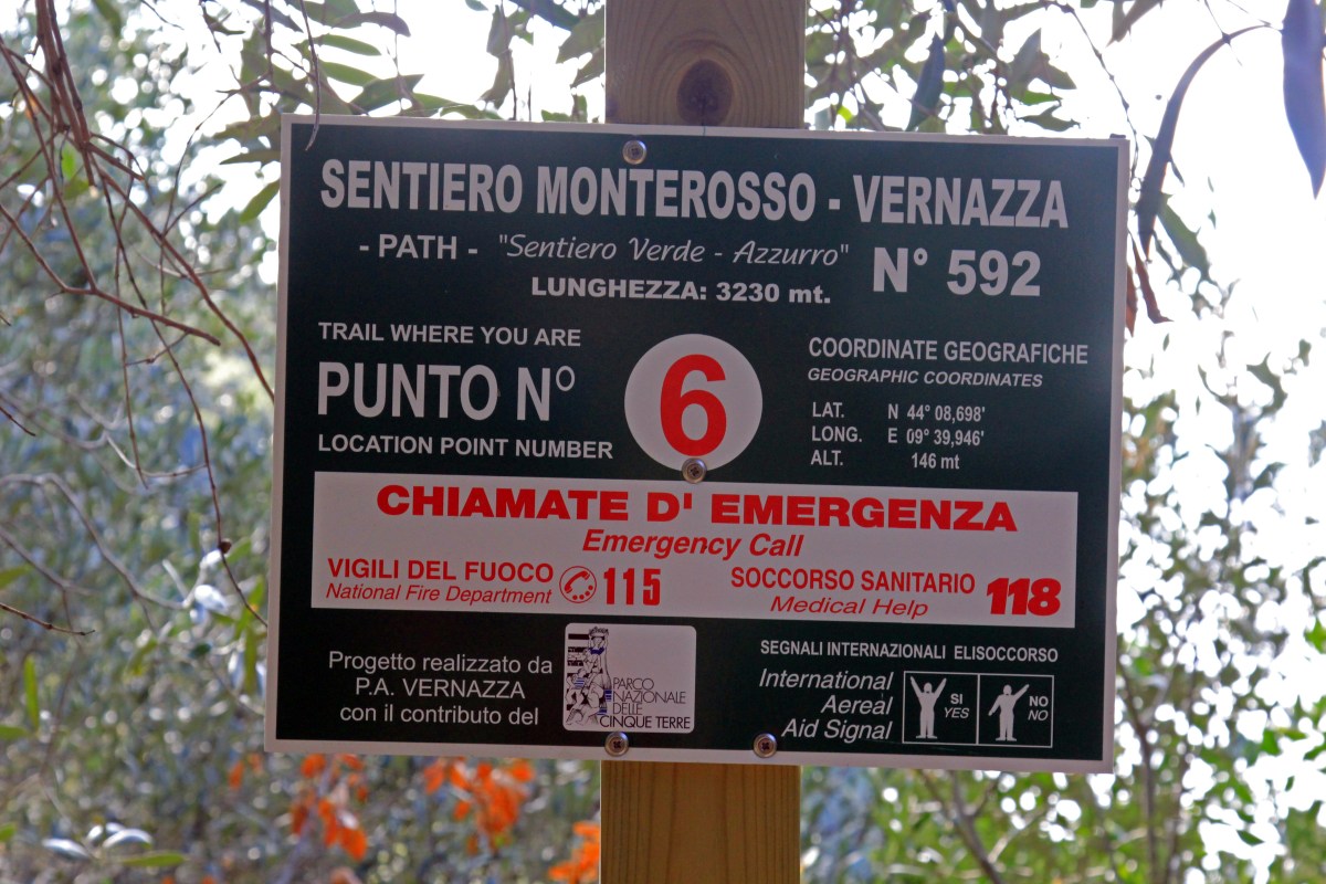 Cinque Terre-029 Published September 23, 2014 at 5184 × 3456 in Monterosso al Mare to Vernazza, 3.6km ← Previous Next → An emergency sign along the path from Monterosso Al Mare to Vernazza