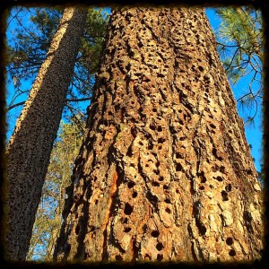Acorn woodpeckers have made these holes to store their acorns!
