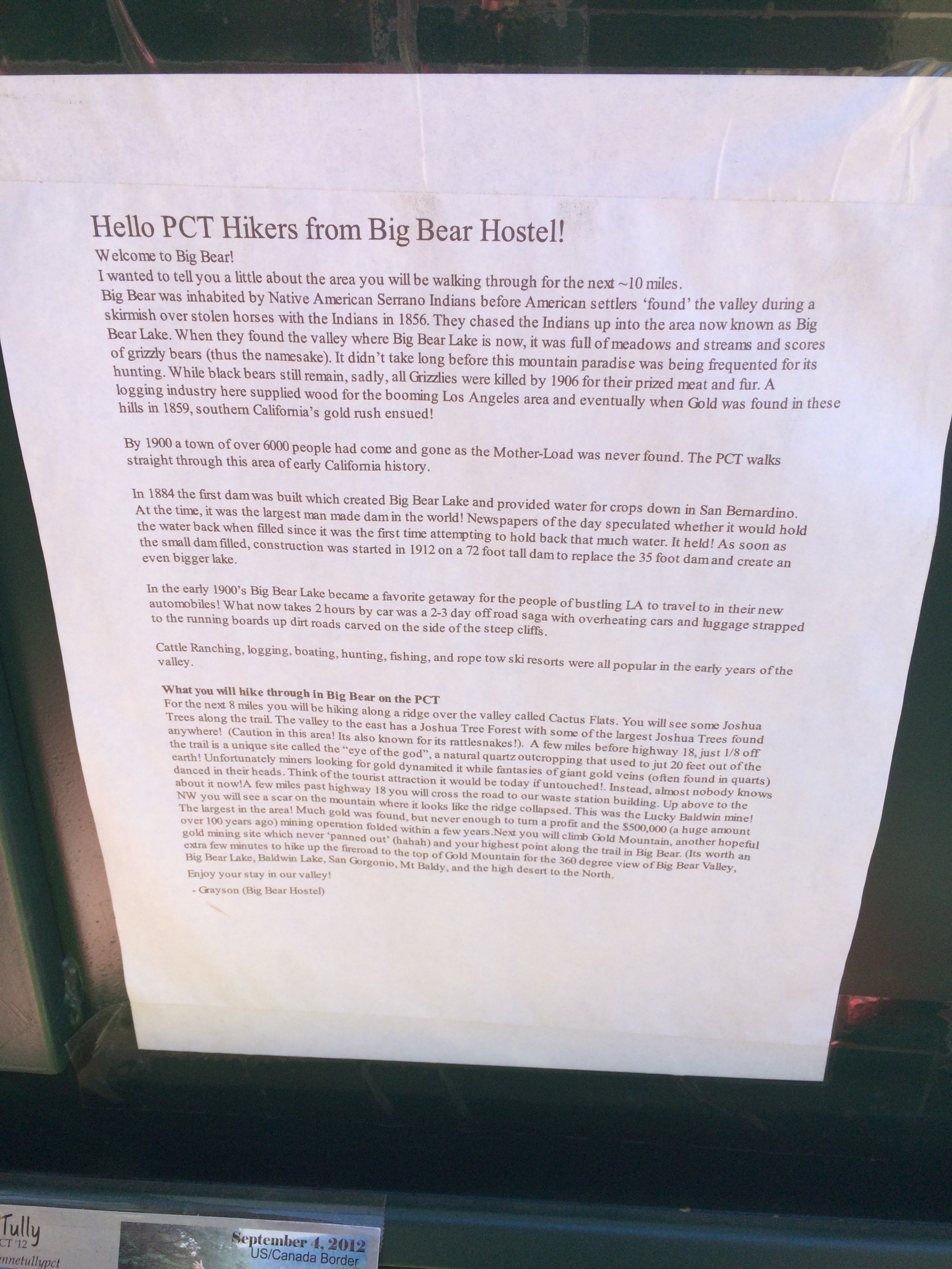 There were two older men waiting for a ride from a trail angel and Becca and Nomad were waiting for family to come and pick them up so I had an audience of 4 hikers while I stood on the other side of the road trying to hitch a ride to Big Bear Lake. It took 3 minutes and a couple of cars before a very kind lady called Noelle stopped to pick me up. She was running late to pick up her children from school so first we picked up her daughter from one school, then her son and husband from another, then we went to the post office and then she dropped me off at the hostel 🙂