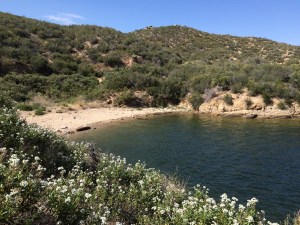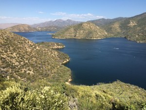 It was a lovely walk out of the canyon but the definite highlight of the day was walking around a corner and seeing an enormous lake unfold before me. I think it’s called Silverwood Lake and it looked so inviting! As it was the weekend, there were speedboats and jet skis and banana boats and people fishing on the lake. … I was going to go for a swim at the first chance I got!