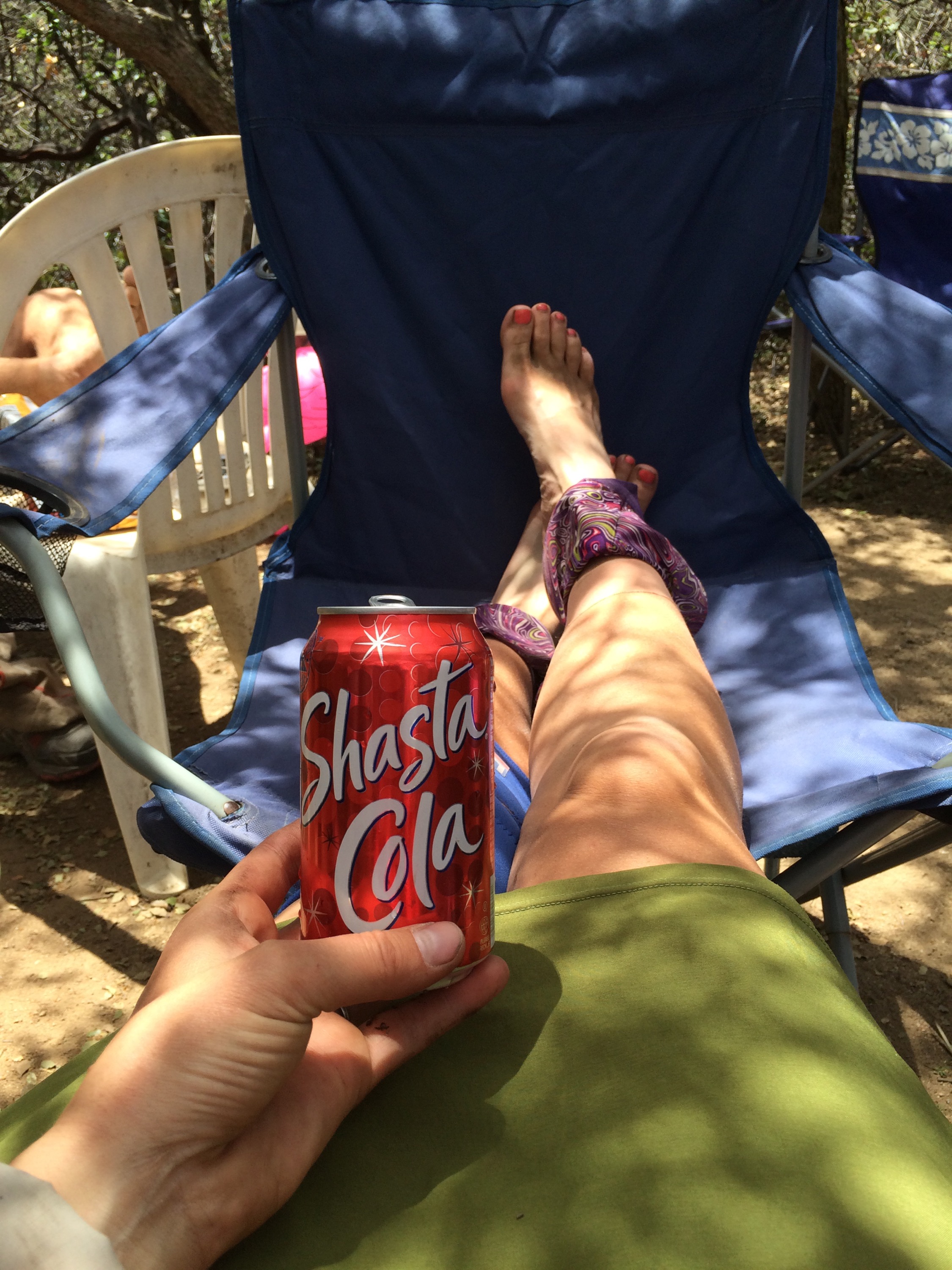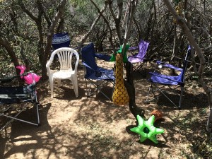With 7 miles to go and wanting to crawl into a bush to have a nap, I came across a cache maintained by Trail Angels, Terrie & Joe Anderson. It was like paradise!! It was fully stocked with sodas and beers, and there were plenty of chairs in a shady spot with flamingo balloons and crazy things hanging from trees. I was so grateful as I took off my shoes, sat on a chair with my legs resting on another and opened a coke.