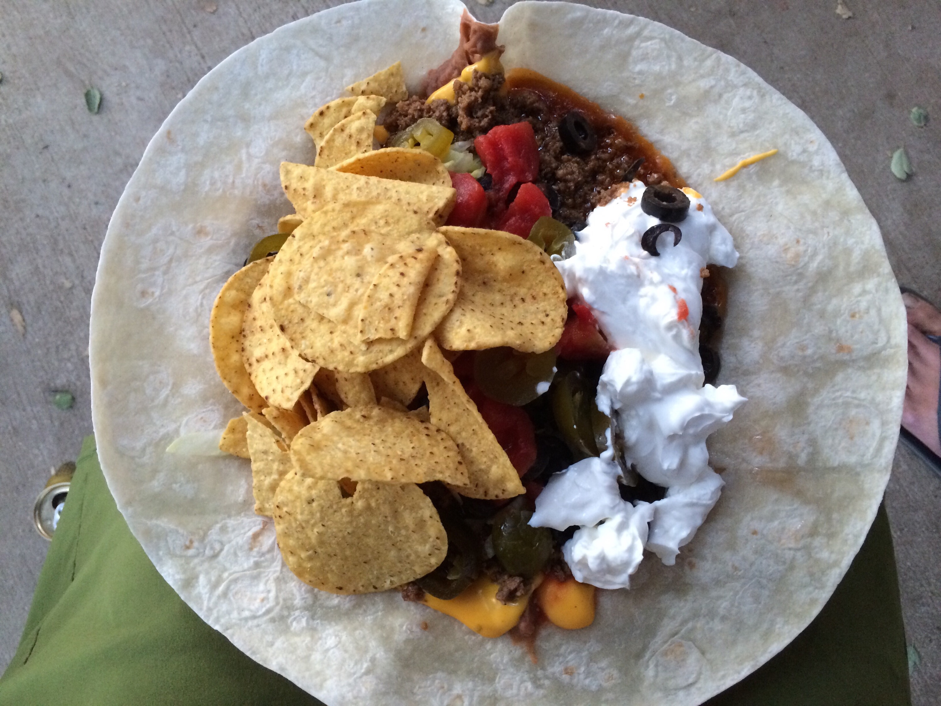 I pitched my tent, changed into the Hawaiian Shirt and soon after, Rowan & Cuban B arrived too. The three of us walked down to the shop to buy some beers and snacks and dinner was almost ready when we got back. Dinner was awesome! A taco salad/burrito buffet, beers and terrific hiker trash company 🙂