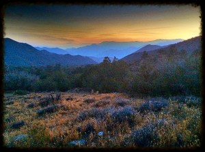 I walked another mile past the spring and was worried about where I would camp as the only listed campsites on the map were for 1 tent each and they were a further 3 and 6 miles up the trail but it was now after 7pm – you need to use a headlamp from 8:15pm ish. I saw what looked like a flat sandy spot near a Joshua tree about 15 metres off the path and headed down to have a look. I found Smokey camped there, shaded from some trees and he pointed out a better spot in front of his tent and let me camp for the night in his front yard. We had a wonderful chat and stunning views of the mountains.