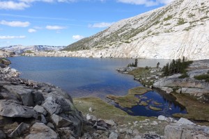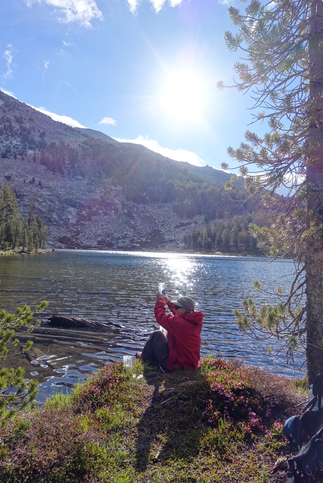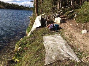 About 45 minutes after leaving camp I came to a lake with a nice breeze and sunny spot and decided to dry out my gear then and there… I was worried about the dark storm clouds that seemed to be hovering over the direction we were headed.