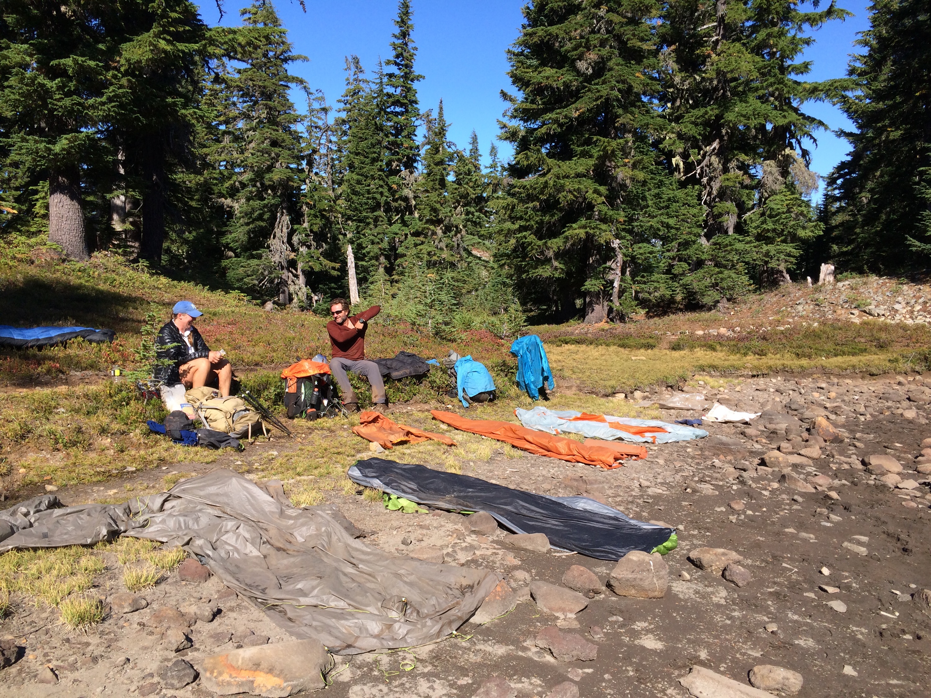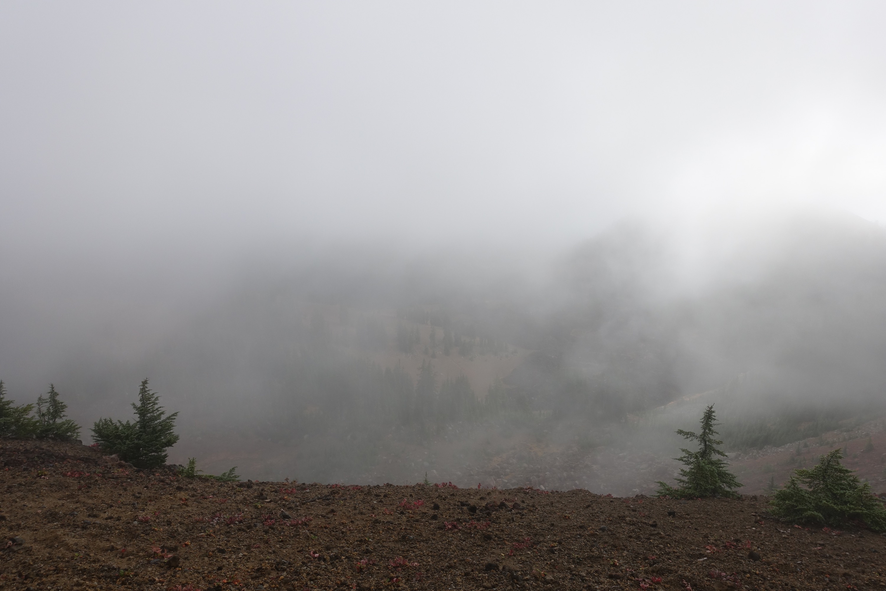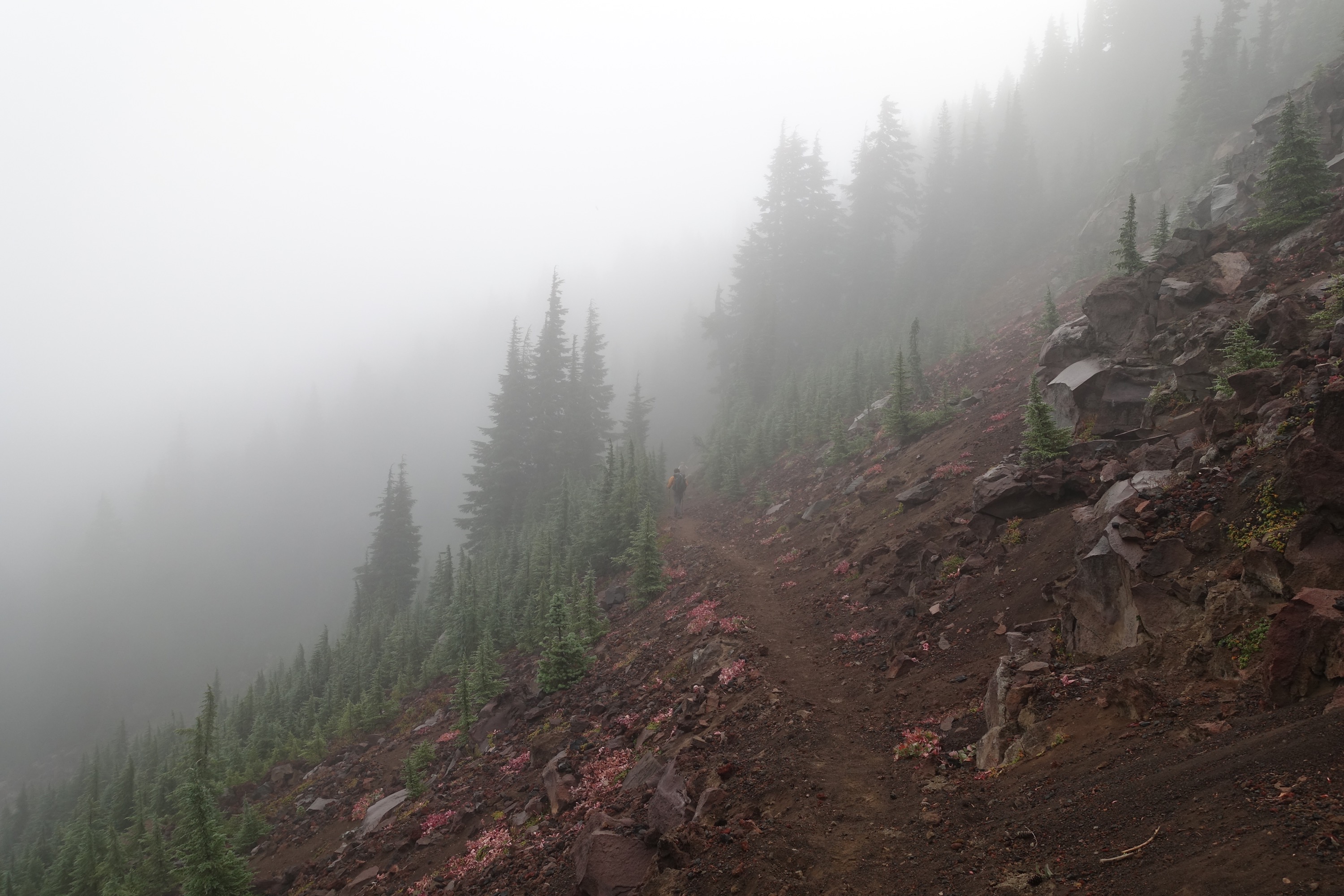 KC and I were up at 5, just before Shepherd, and everything was wet… It was sprinkling outside, the lake had disappeared in the mist and it was freezing cold. Usually I would get everything out of my tent and pack it up before eating breakfast but today I tried to delay packing up my tent for as long as possible because it was so wet. When I did finally wrap up my tent it was completely saturated and heavy… It got me thinking how lucky we’ve been with the bad weather that there’s never really been any consecutive days of bad weather so we’ve always been able to dry out our gear in the sun during the day… I really hoped today would be the same, but it certainly didn’t start out nice.
