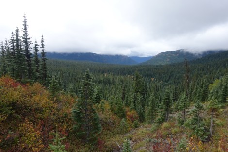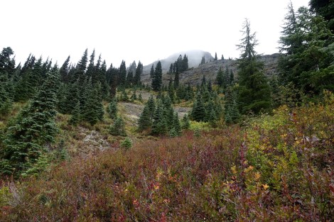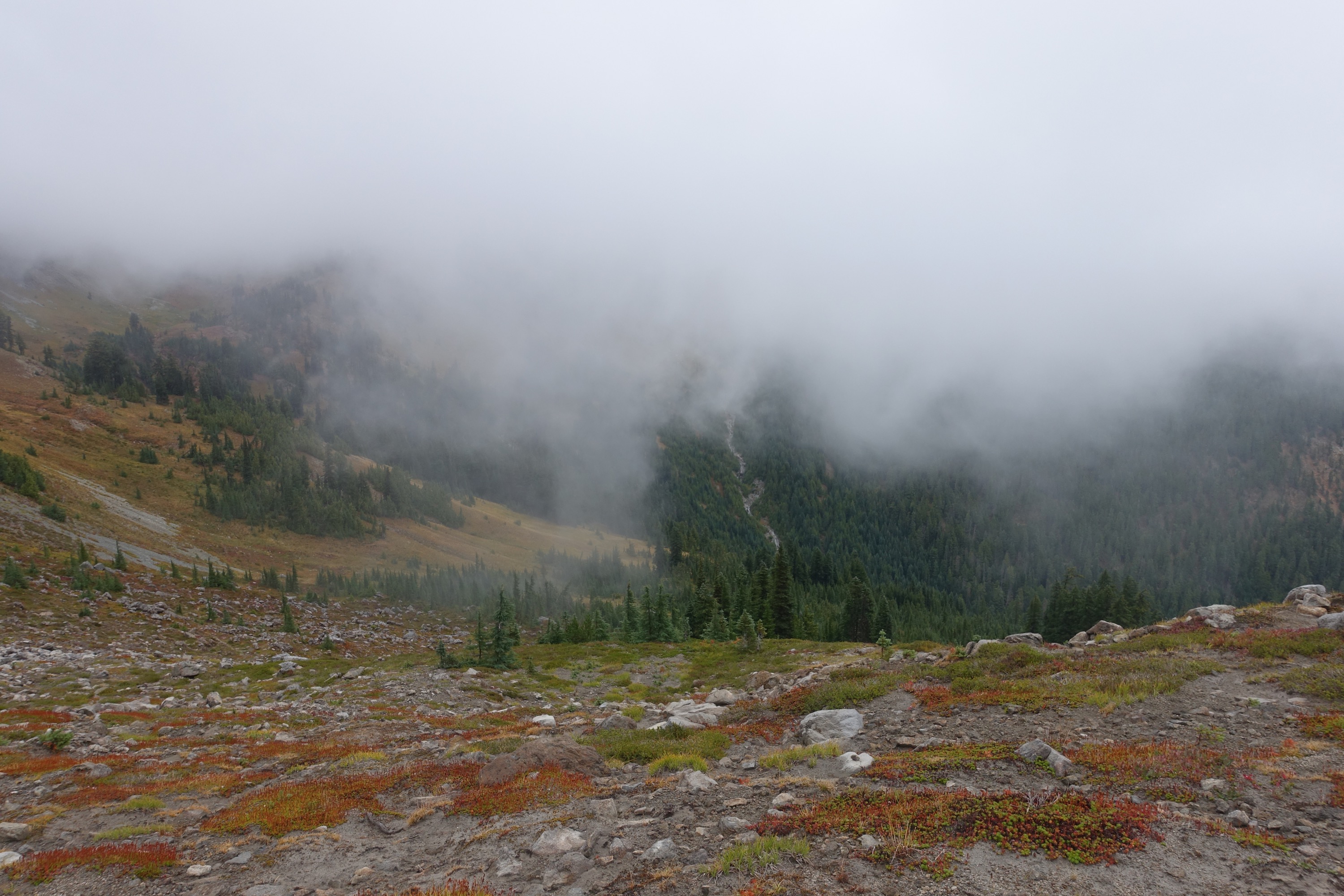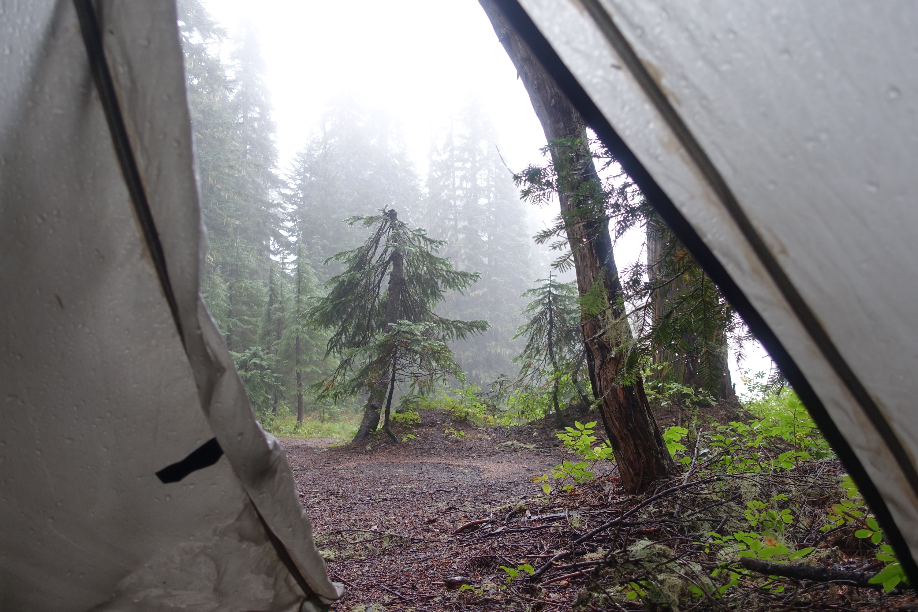 It rained all through the night and I could hear the wind through the trees but we were luckily protected from it. I opened my vestibule at 6am to look outside… we were enveloped in a thick mist, I couldn’t see 3 metres past my tent.