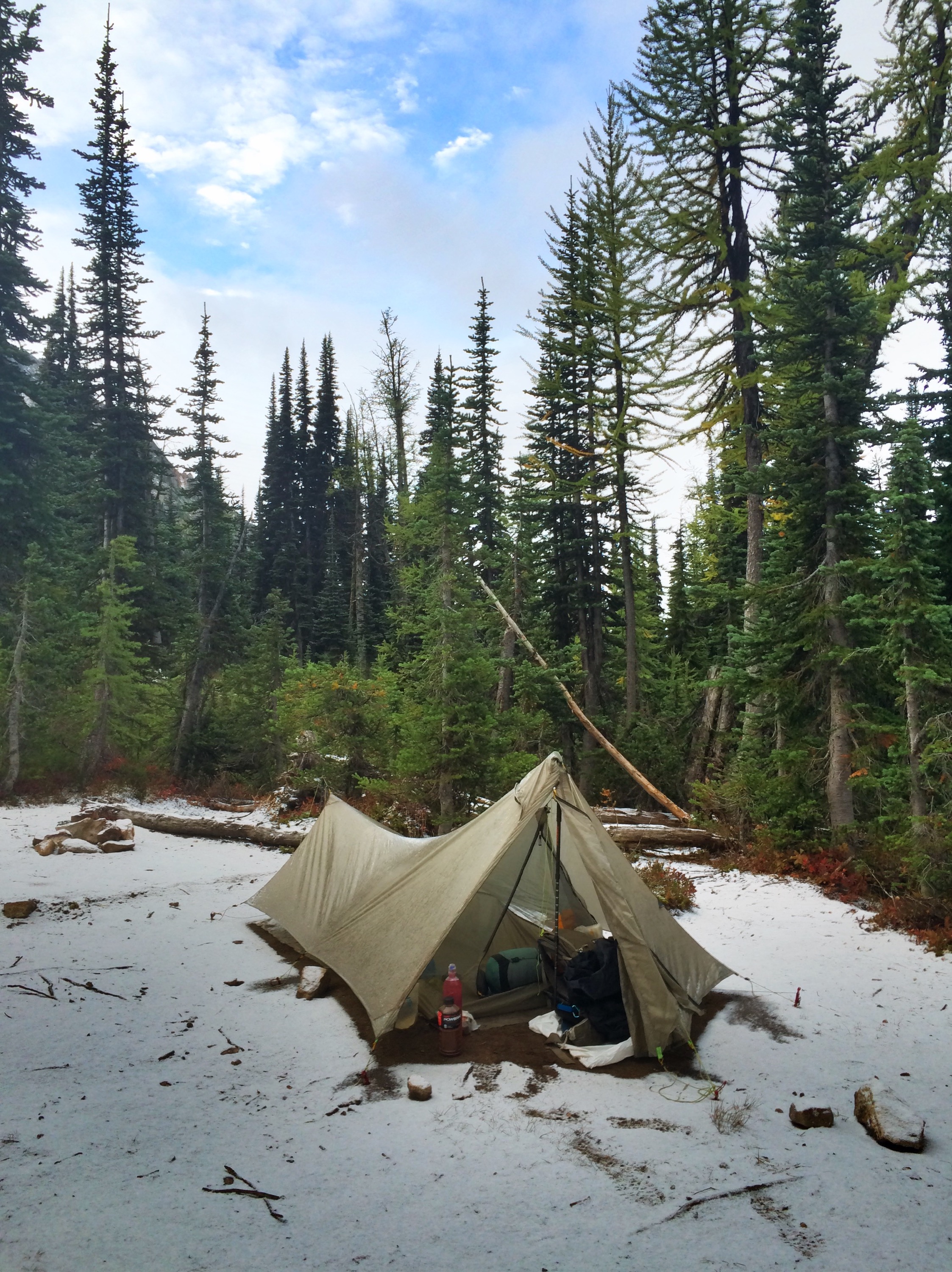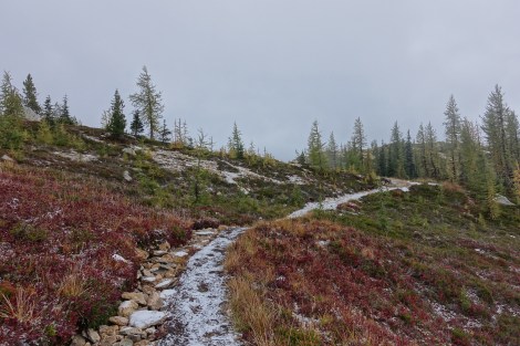 I woke up at 5:30 needing to go to the toilet, just at the same time it started snowing. I went back to sleep, woke up again at 7 with my tent and the ground covered in snow. “That’s ok, there’s only 2 more nights which means 2 more chances of packing up a wet tent” I told myself. Rainbow walked past as I was packing up, she was 500 feet lower than me and got rain but no snow. We talked about how cold the night had been – the water in my water bottle that was in my vestibule had frozen!