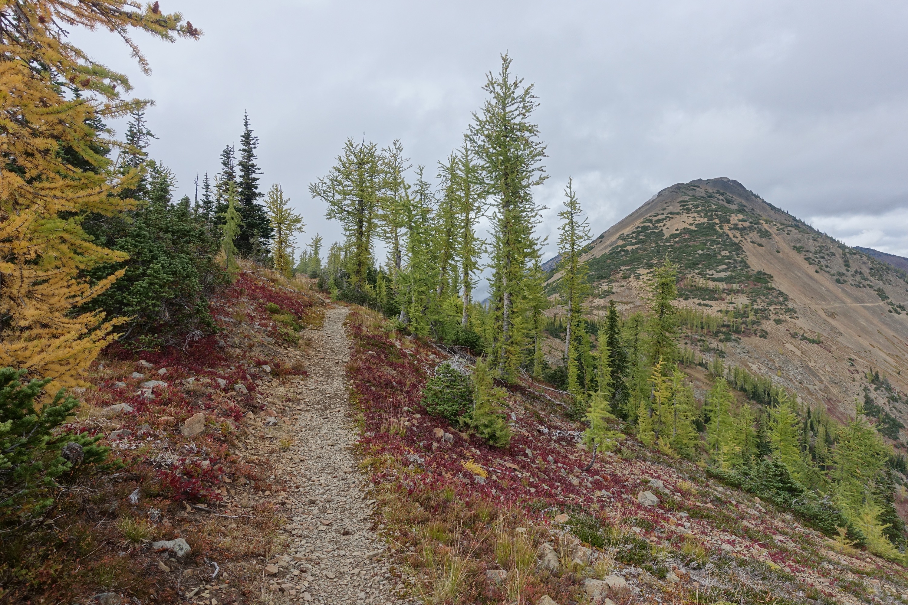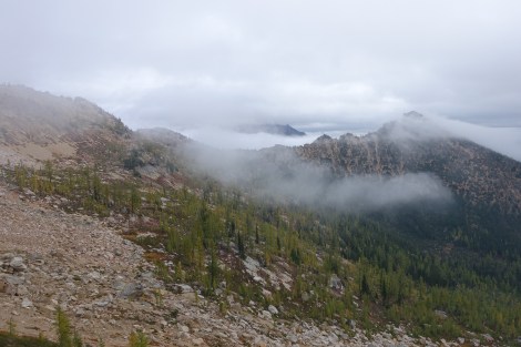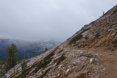 It started raining as the trail climbed up again. I put on my $1 plastic poncho that I bought back at Trout Lake (over my rain jacket and rain skirt) and continued… This cheap poncho has served me well 🙂