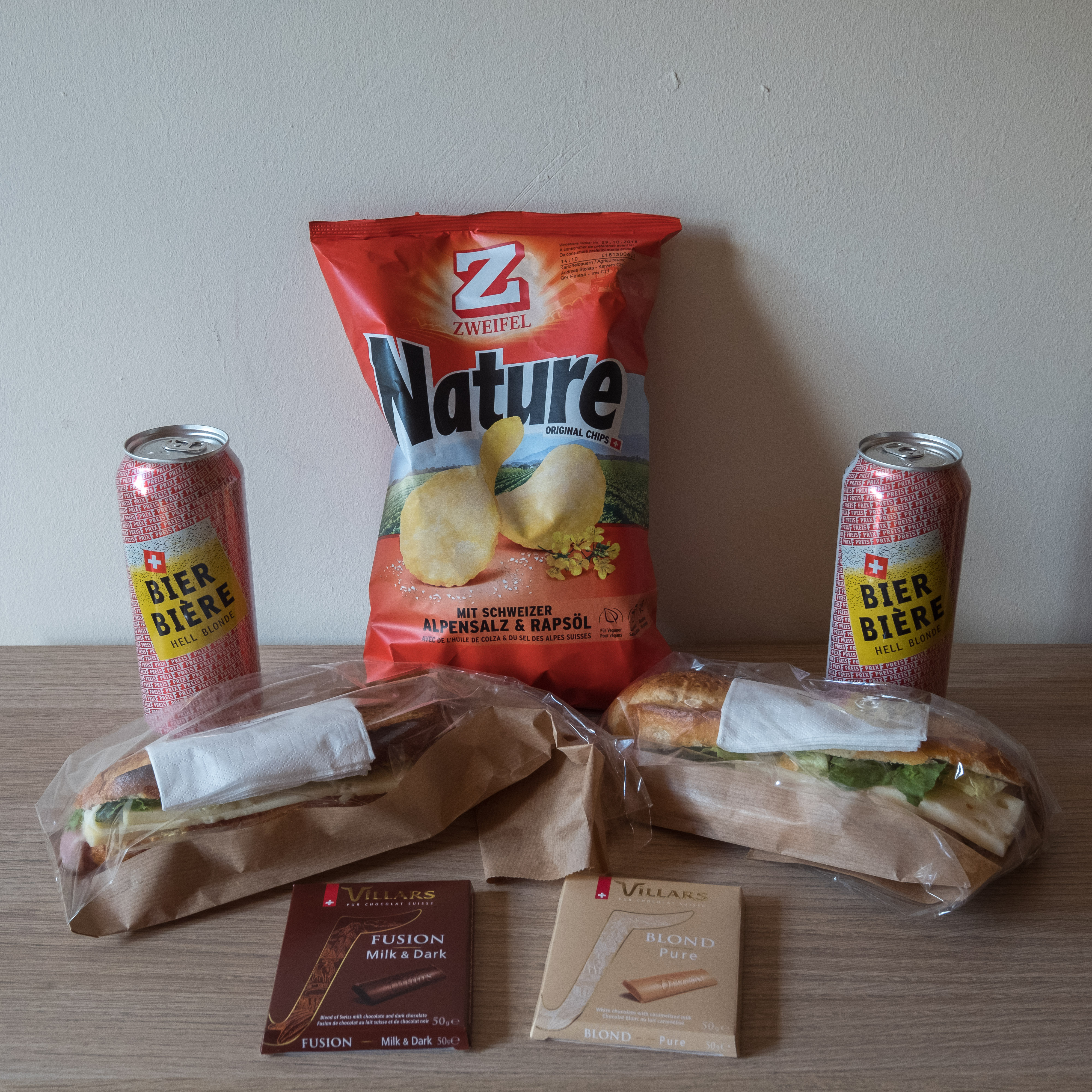 We checked into Ptarmigan guesthouse (booked through booking.com for £103 including breakfast), which was a few steps from the bus stop, then went for a wander around the lake and small town. We checked out some restaurant menus looking for somewhere for dinner (most meals started from CHF 25) then went to the local supermarket and saw a sign on the deli counter advertising baguettes for CHF 5.50. This sounded perfect, so we ordered cheese and meat sandwiches with the local Swiss cheese, grabbed two cans of the cheapest Swiss beer we could find (CHF 1), some chocolate and chips, and this was our terrific dinner that we ate on the balcony of our accommodation, overlooking the lake.