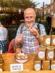 Dad tasting peanut butter at Columbia Rd flower market and wearing the backpack