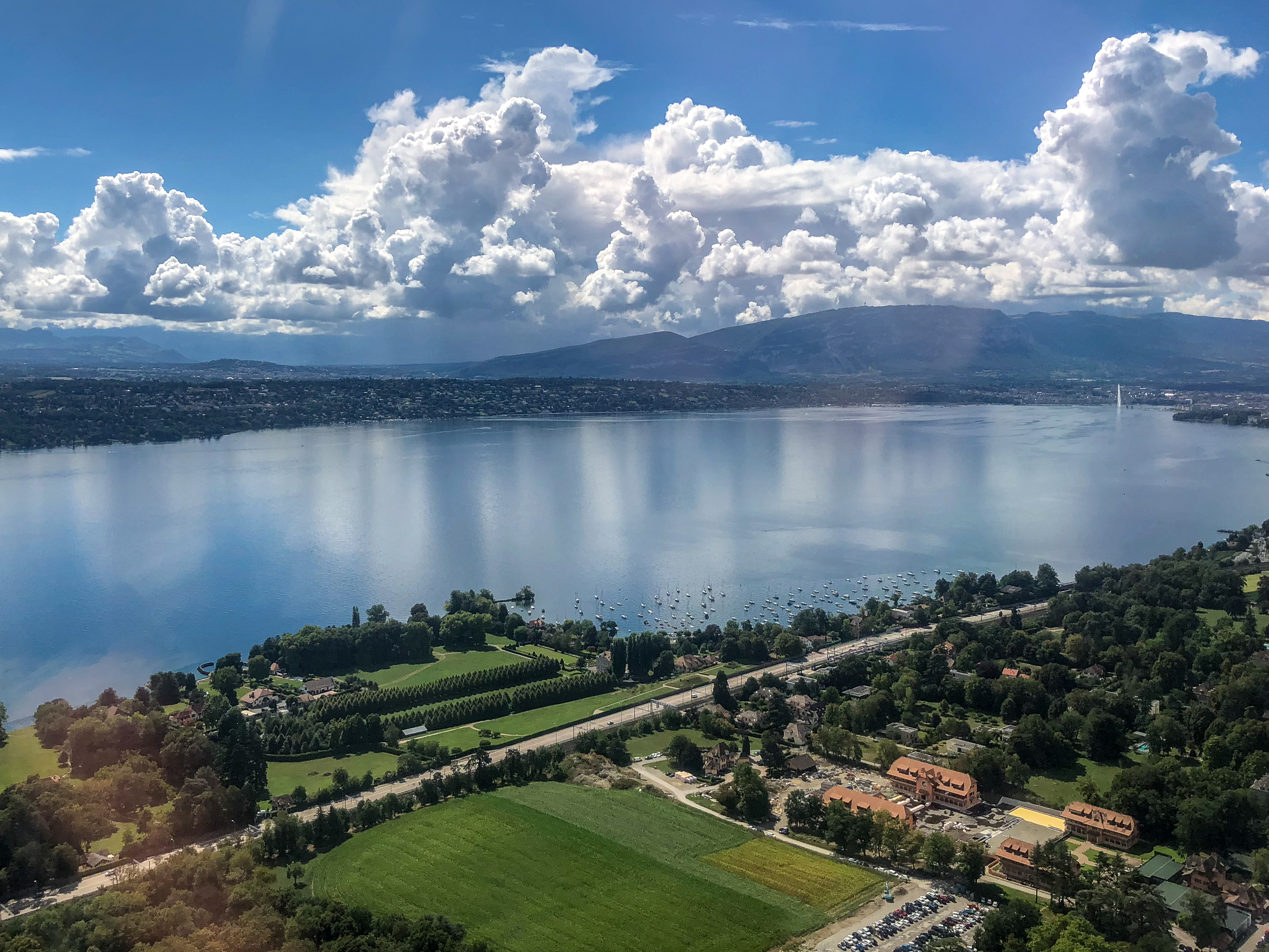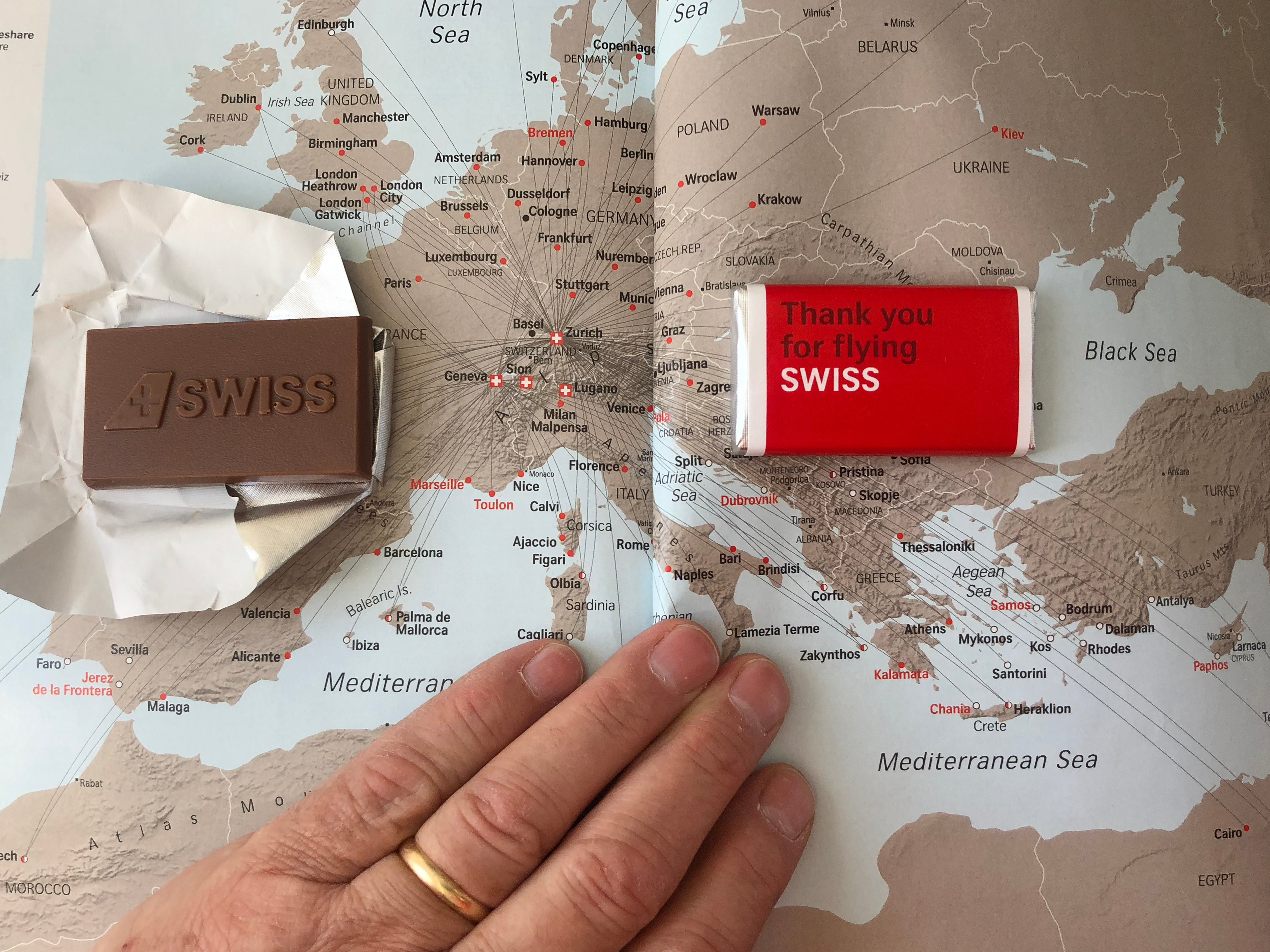 We flew Swiss Airlines, but contrary to our preconceptions of Swiss time and punctuality, the flight was delayed by half an hour.  A free onboard meal and Swiss chocolate was a nice touch, but the delay meant we had missed the train from Geneva airport that we were hoping to catch.