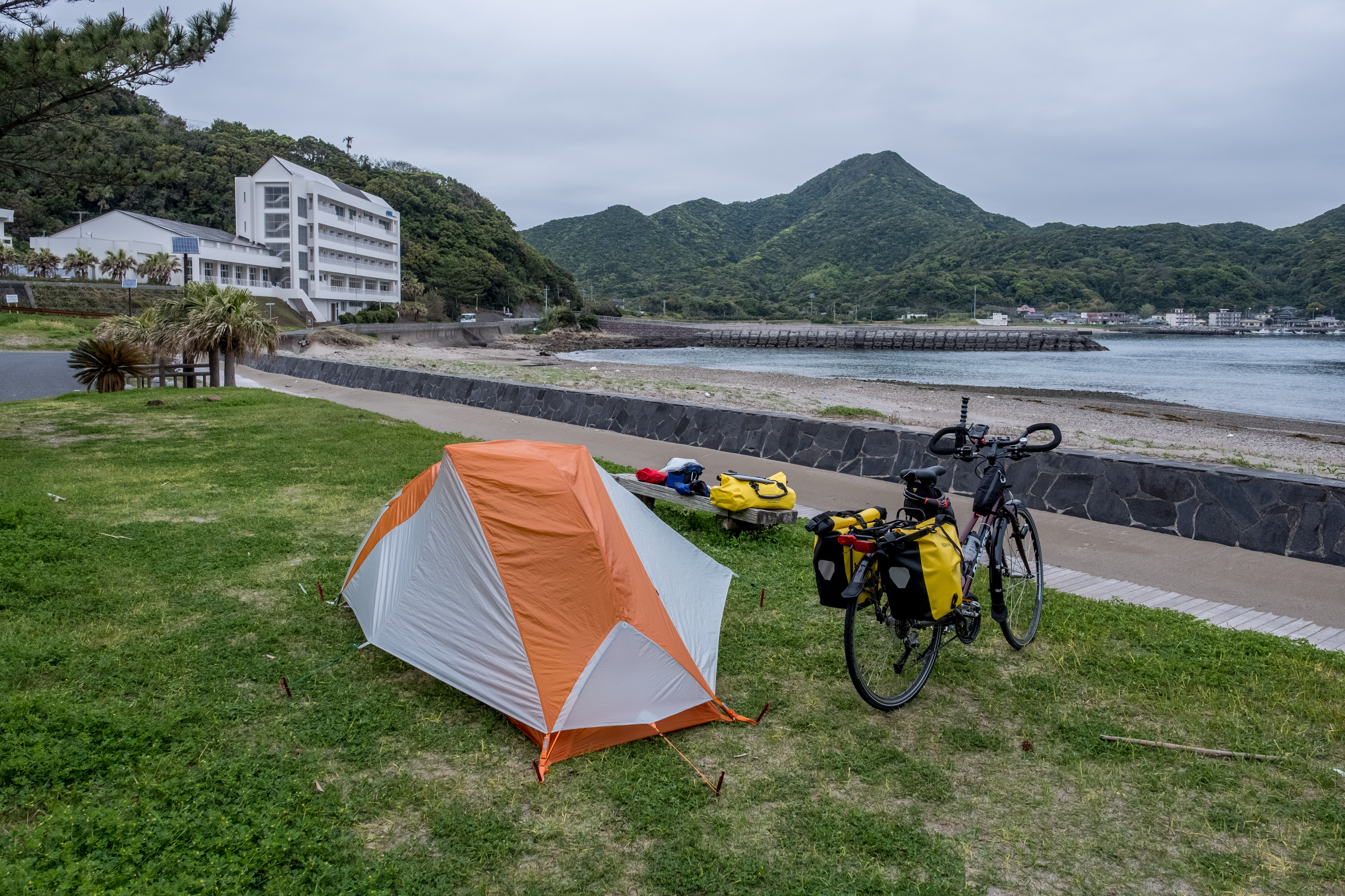 Camping at Odomari free campground Published May 7, 2019 at 6000 × 4000 in Cycling Japan – day 2 – Nejime to Sata Misaki ← Previous Next → Camping at Odomari free campground next to a nice hotel (where I had dinner, an Onsen and charged some electronics!)