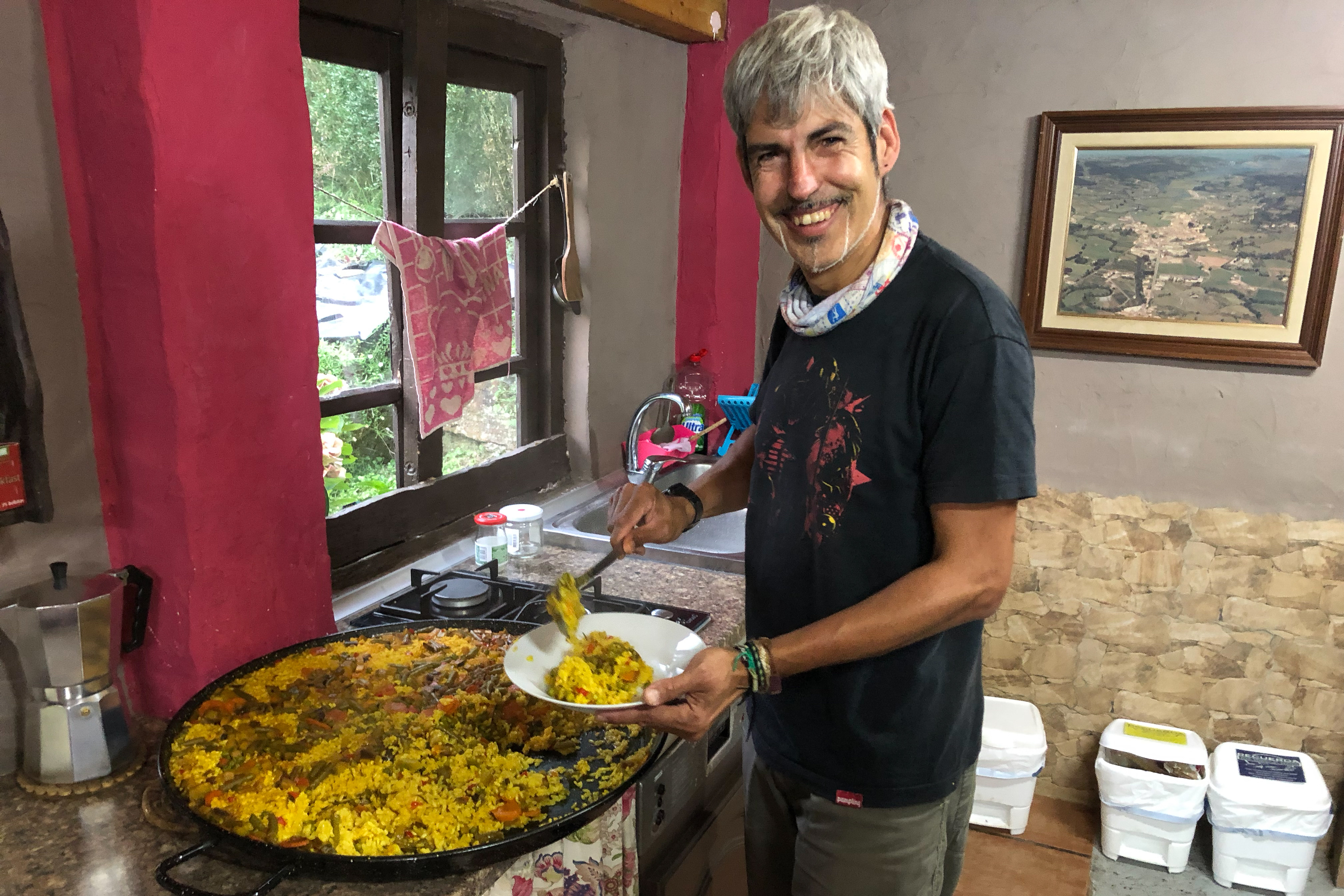 Sergio serving up a delicious vegetable paella at his albergue, La Ferrería in Amandi Published November 2, 2019 at 4032 × 2688 in Camino del Norte – Day 18 – La Vega to Amandi, 33km ← Previous Next → Sergio serving up a delicious vegetable paella at his albergue, La Ferrería in Amandi