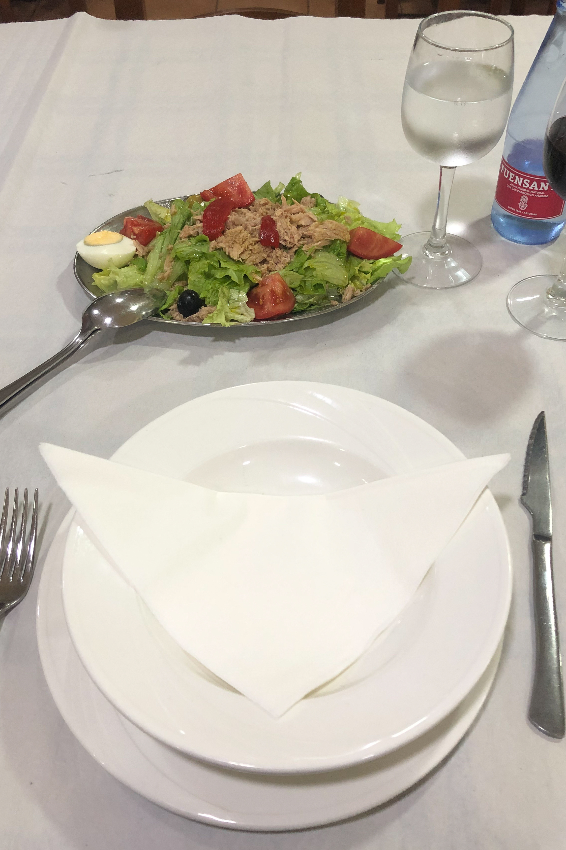 The menu del dia for dinner at Hotel Canero, mixed salad (ensalada mixta) for a starter Published November 2, 2019 at 2283 × 3424 in Camino del Norte – Day 22 – Soto de Luiña to Canero, 27km ← Previous Next → The menu del dia for dinner at Hotel Canero, mixed salad (ensalada mixta) for a starter