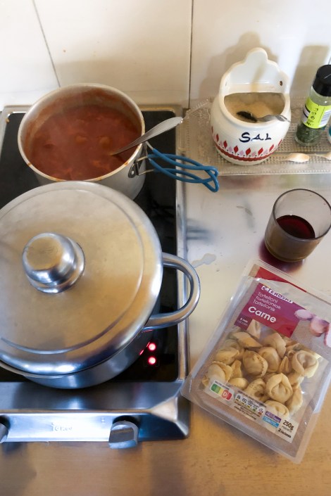 - Making pasta for dinner with onion, tomato and chorizo at Albergue de Peregrinos de Lourenzá