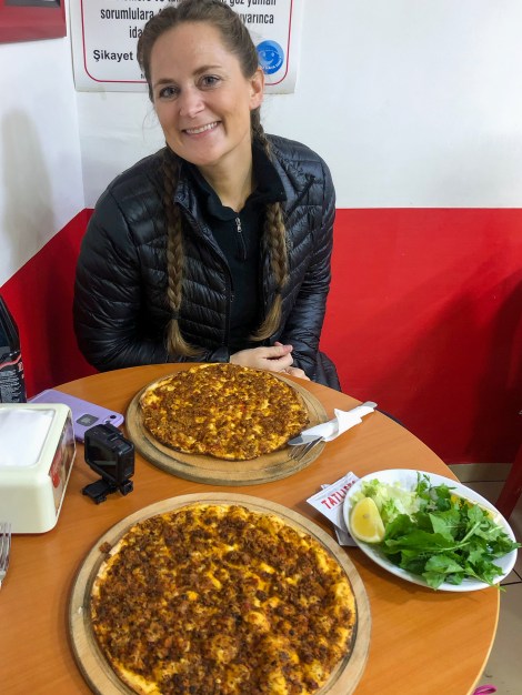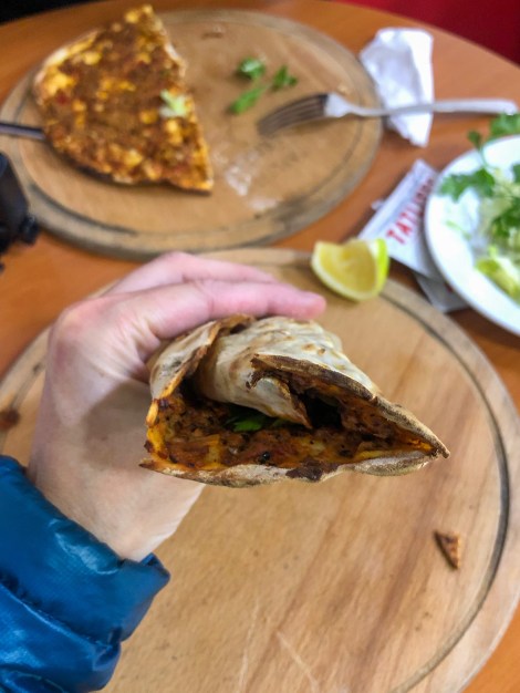 Unsurprisingly, we walk and walk but can’t find any restaurants open! Eventually a local points us in the direction of a small takeaway shop with a couple of tables and we order what the others are eating – lahmacun, a type of Turkish pizza. We don’t know what the topping is, and it’s probably best this way, but it hits the spot. So much so, we order a third to share. Three pizzas for ₺24 (approx. £3), wow that’s cheap!